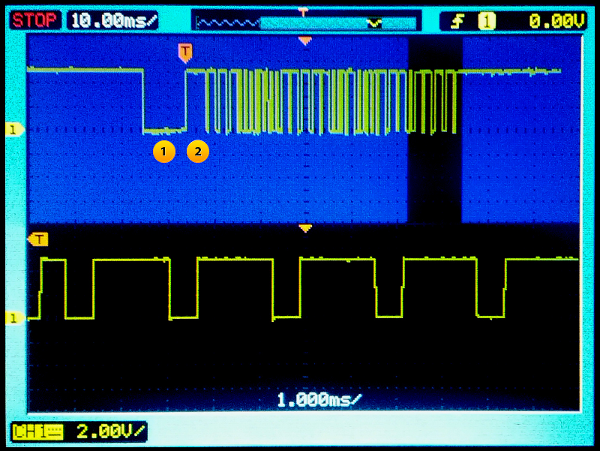 First thing to do was to check what kind of signal I was getting out of the TSOP module when I press a button on a remote control. So I wired up the module to an Arduino as shown in the above image. Pin #3 is the output of the TSOP, which is wired to the Arduino’s pin #2 and power supply is taken out of the 5V-GND header of the board. The reason why I wired up it with Arduino is that I didn’t have a separate 5V power supply here ;). Anyway I hooked up my oscilloscope’s probes to the TSOP module and pressed a button on the remote control. Bingo! I got a signal that looks like the following.
