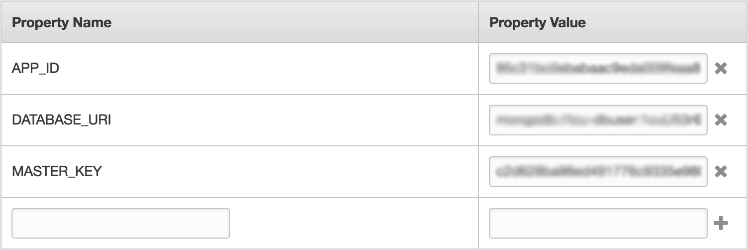 Now, that we have all the basic components, you may go ahead and configure the EB environment variables. Parse server uses environment variables to configure and run the web server. Go to Elastic Beanstalk on AWS console, select the newly created app (the app you created through the CLI should appear here). Click on Configuration on the left pane, and click on the small gear icon on Software Configuration and scroll down to the bottom of the screen, you may see Environment Properties. Add the following three properties and values for each of them.